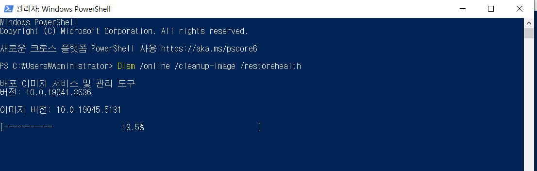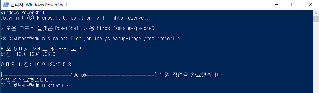 2. DIsm /online /cleanup-image /restorehealth 입력 후 엔터!