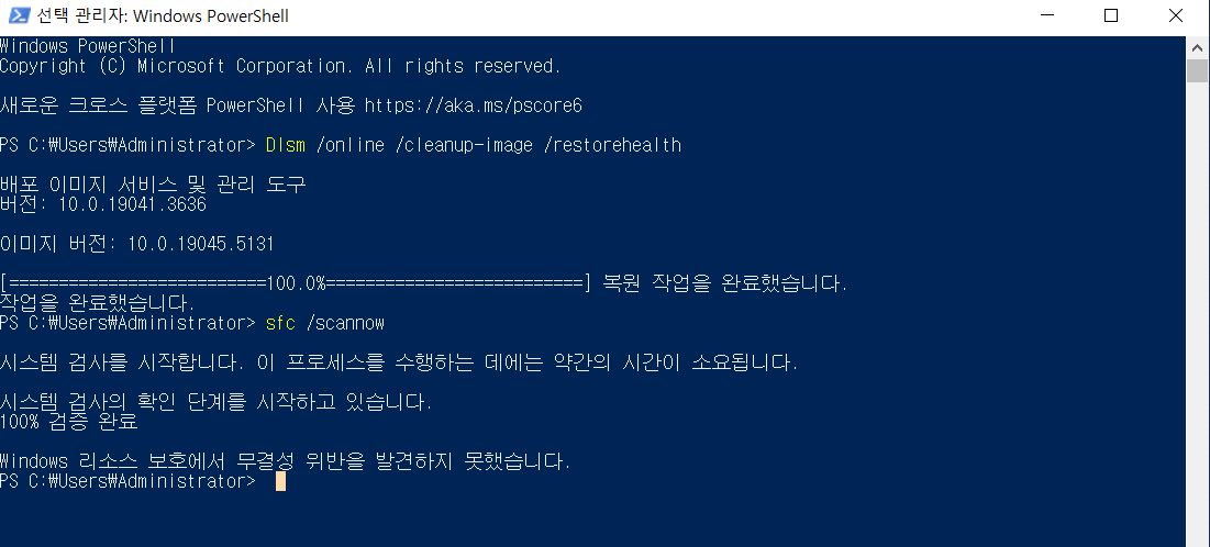 4. 손상된 파일을 확인하고 복구가 진행됩니다. 종료 메시지를 확인합니다.