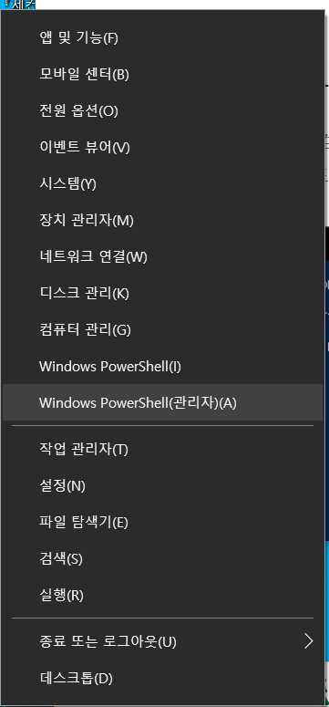 1. 윈도키 + X를 눌러 Windows PowerShell(관리자) 선택