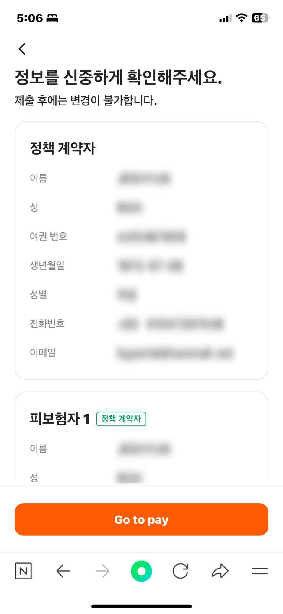 Step3. 여행자 여권번호, 전화번호 이메일주소를 추가 입력후 정보를 확인한다.