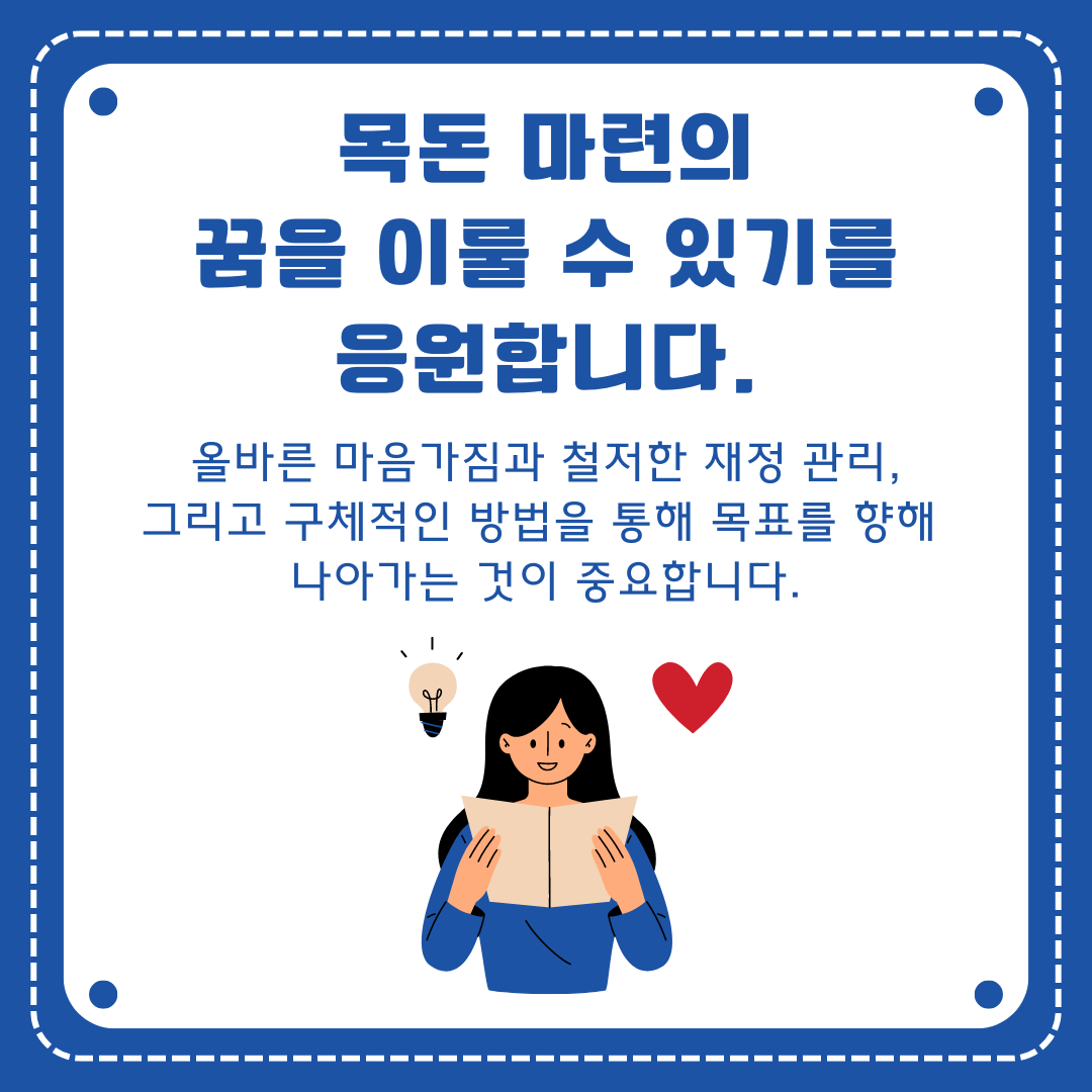 올바른 마음가짐과 철저한 재정 관리, 그리고 구체적인 방법을 통해 목표를 향해 나아가는 것이 중요합니다.