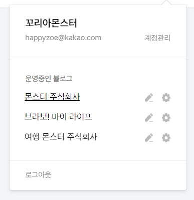 수익형 블로그를 세팅하기 위해서 톱니바퀴를 클릭합니다.(그럼 블로그관리홈 페이지 이동합니다.)